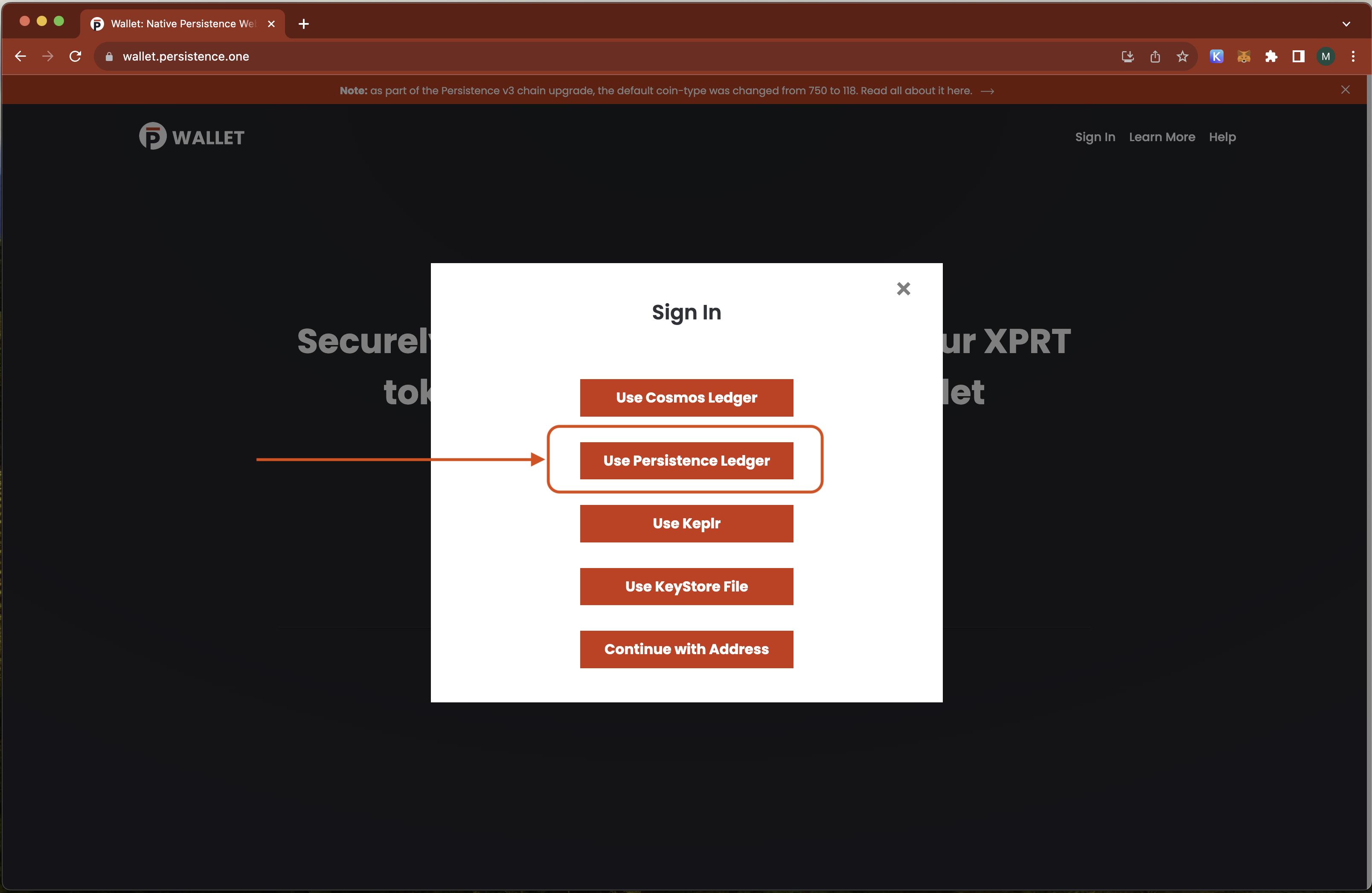 ⚠️ Warning: Getting error while connecting using Persistence Ledger? Make sure you have opened Persistence App on your Ledger
